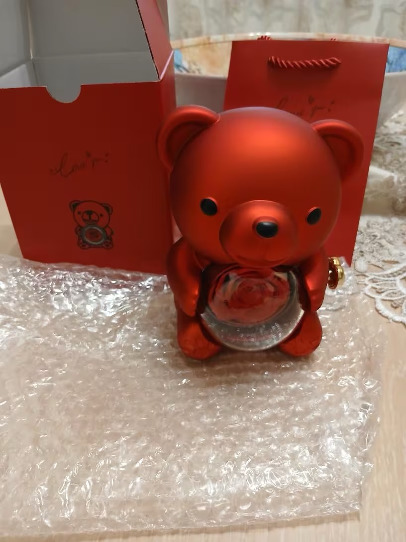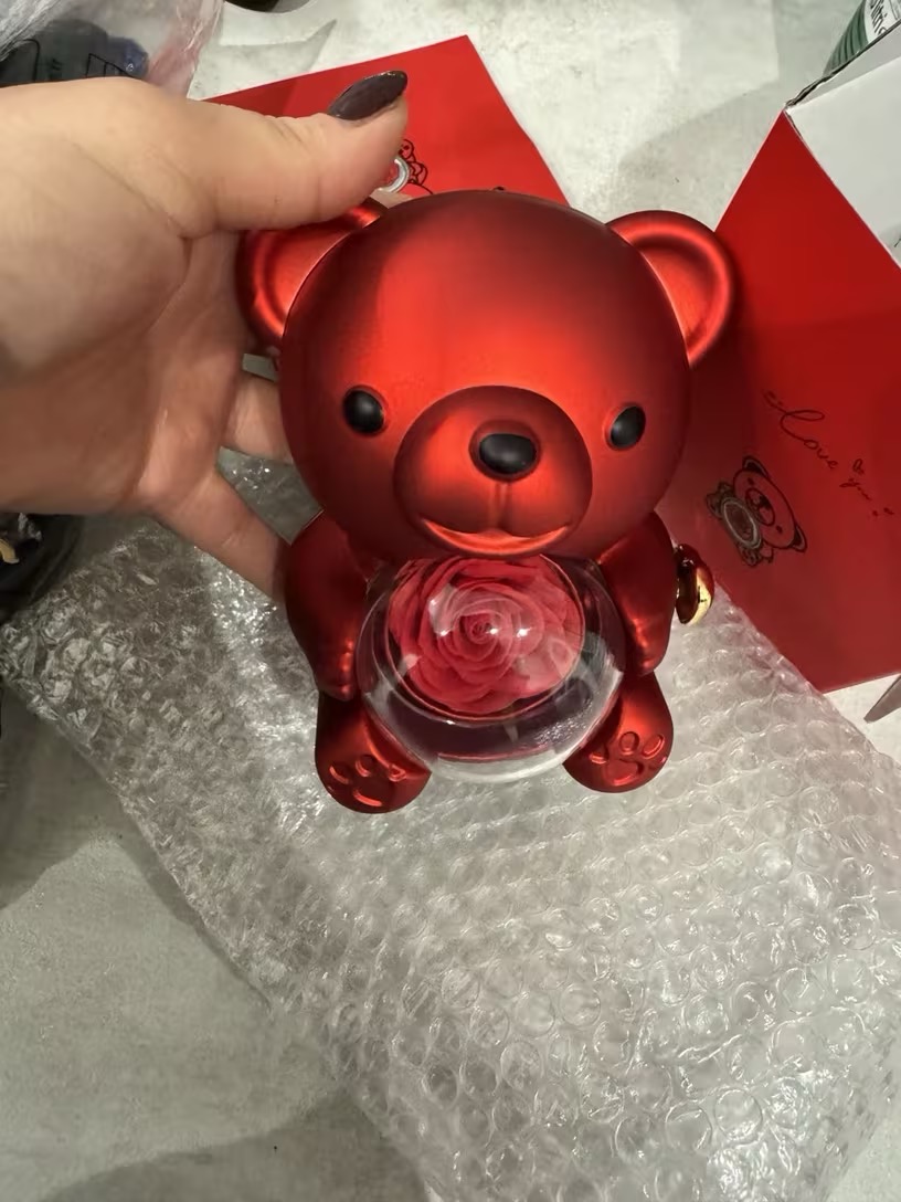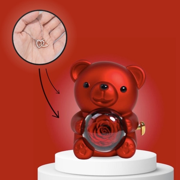 Cutia de bijuterii este concepută sub forma unui ursuleț rotativ fermecător și conține un trandafir natural criogenat, care își păstrează frumusețea naturală timp de 3 până la 5 ani. Prin rotirea butonului se dezvăluie un compartiment ascuns, perfect pentru păstrarea bijuteriilor prețioase 🧸🎀
