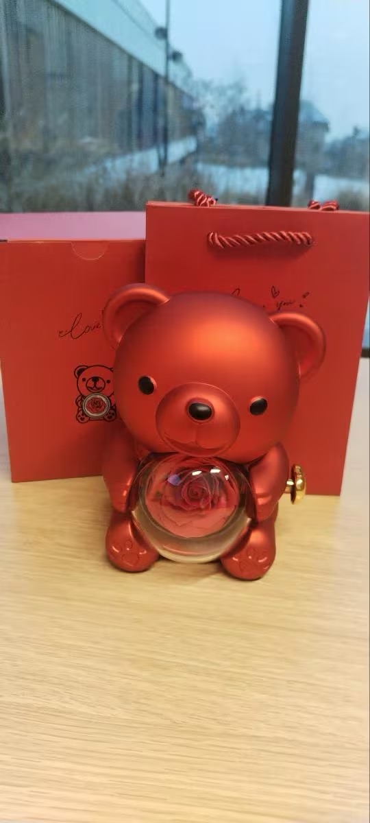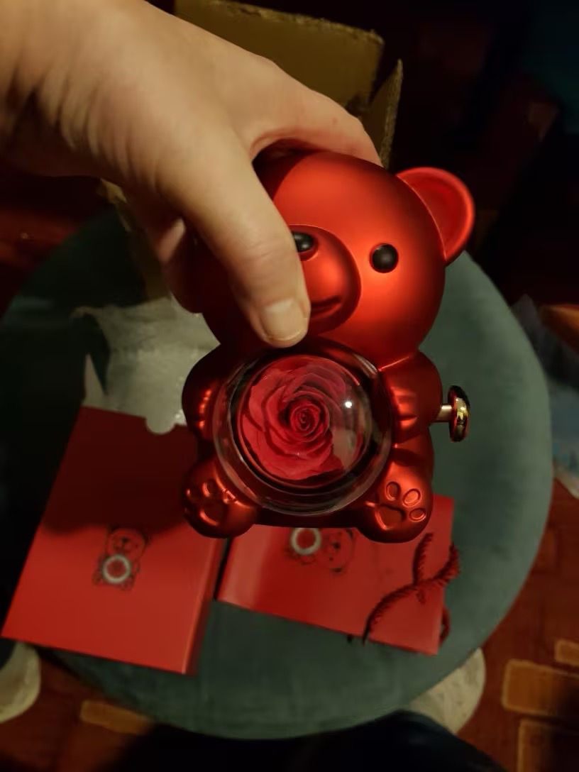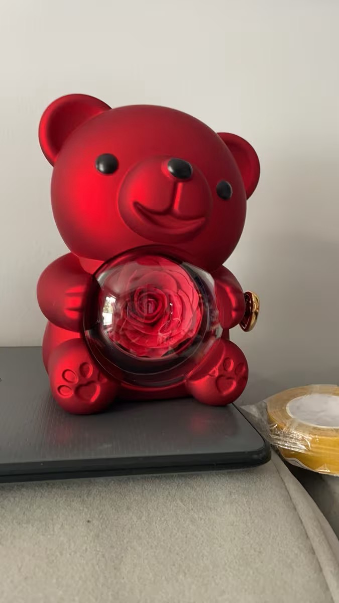 🌹 Cutie de bijuterii cu ursuleț rotativ și trandafir natural criogenat