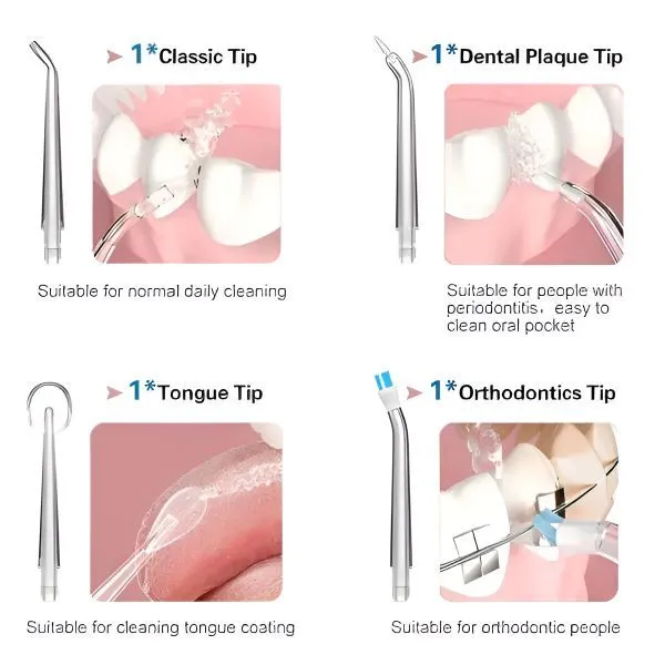 Este echipat cu 4 capete interschimbabile. Cap clasic: potrivit pentru curățarea zilnică obișnuită. Cap pentru placă: potrivit pentru persoanele cu parodontoză, curăță cu ușurință buzunarul oral. Cap pentru limbă: potrivit pentru curățarea depunerilor de pe limbă. Cap ortodontic: potrivit pentru persoanele cu aparate.