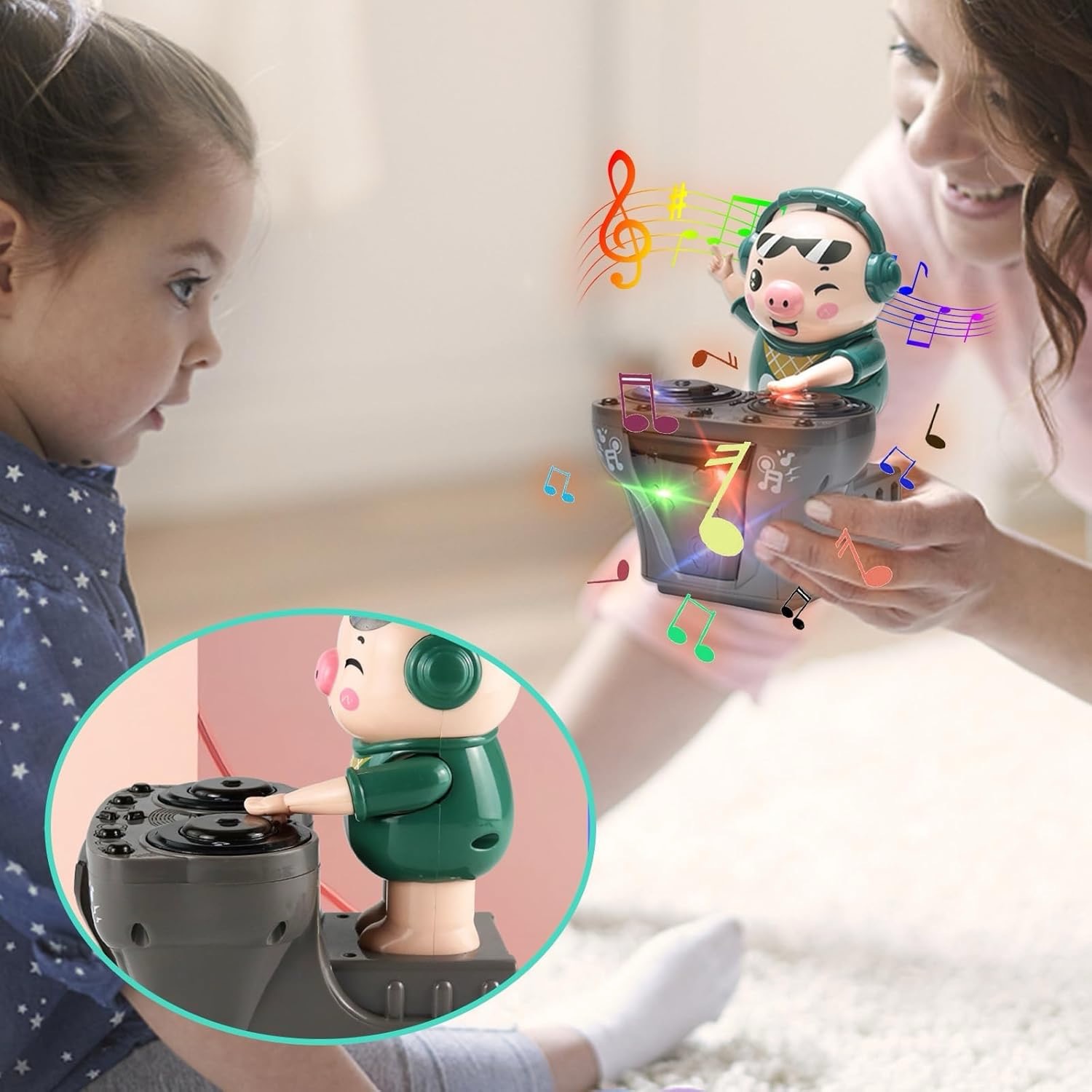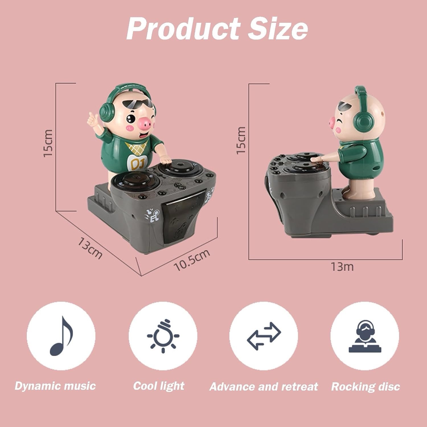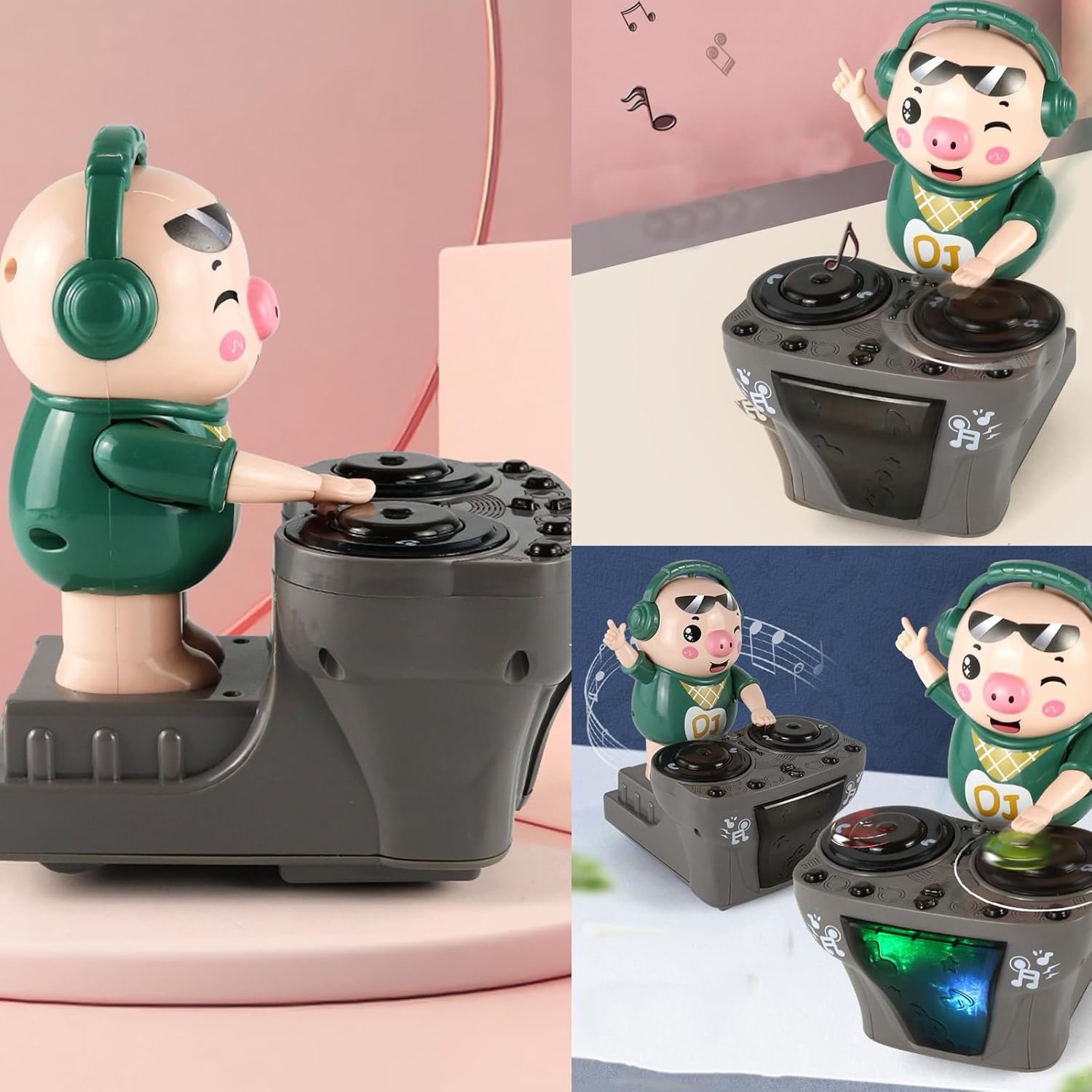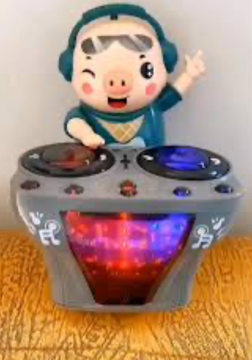 DJPIG se mișcă automat înainte și înapoi legănându-și corpul pe ritmul muzicii. Cu mâinile sale mici care imită mișcările unui DJ, copilul tău va fi fascinat de stilul de dans realist. Este jucăria perfectă pentru micii iubitori de mișcare, dans și muzică.