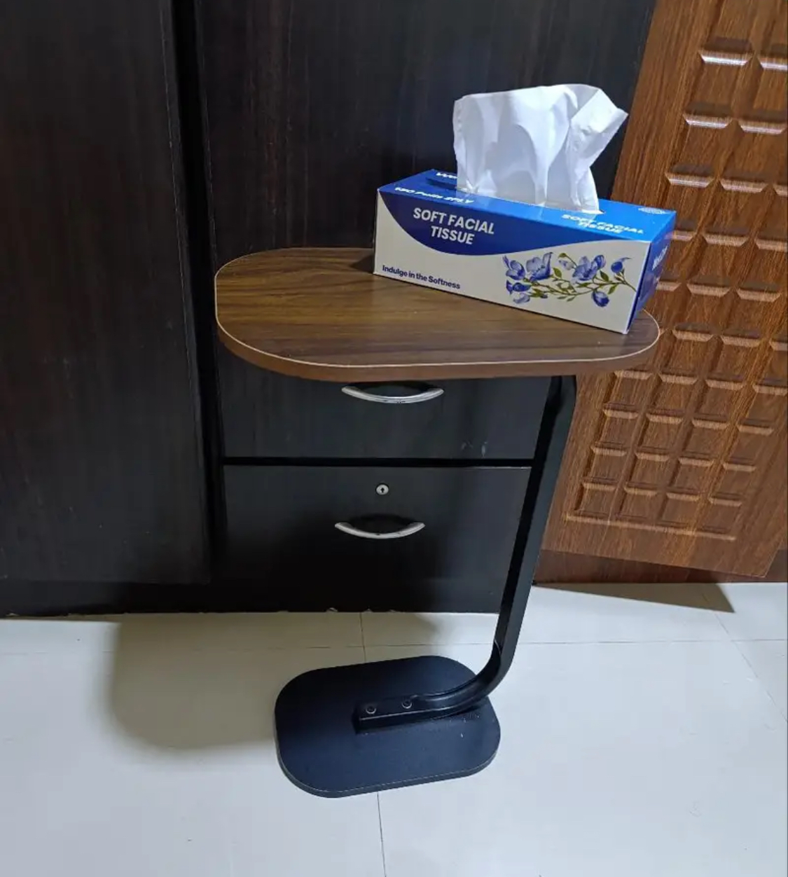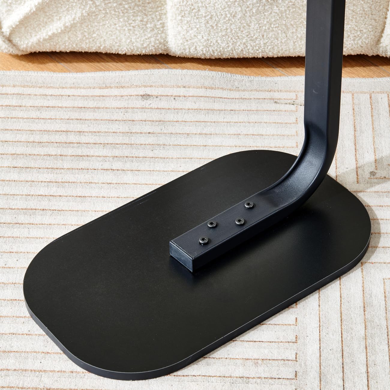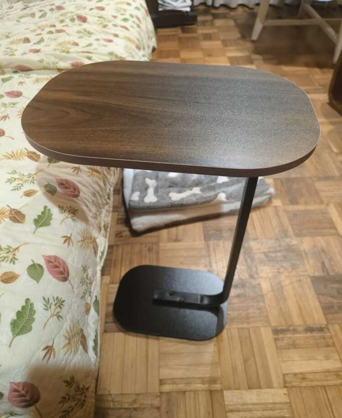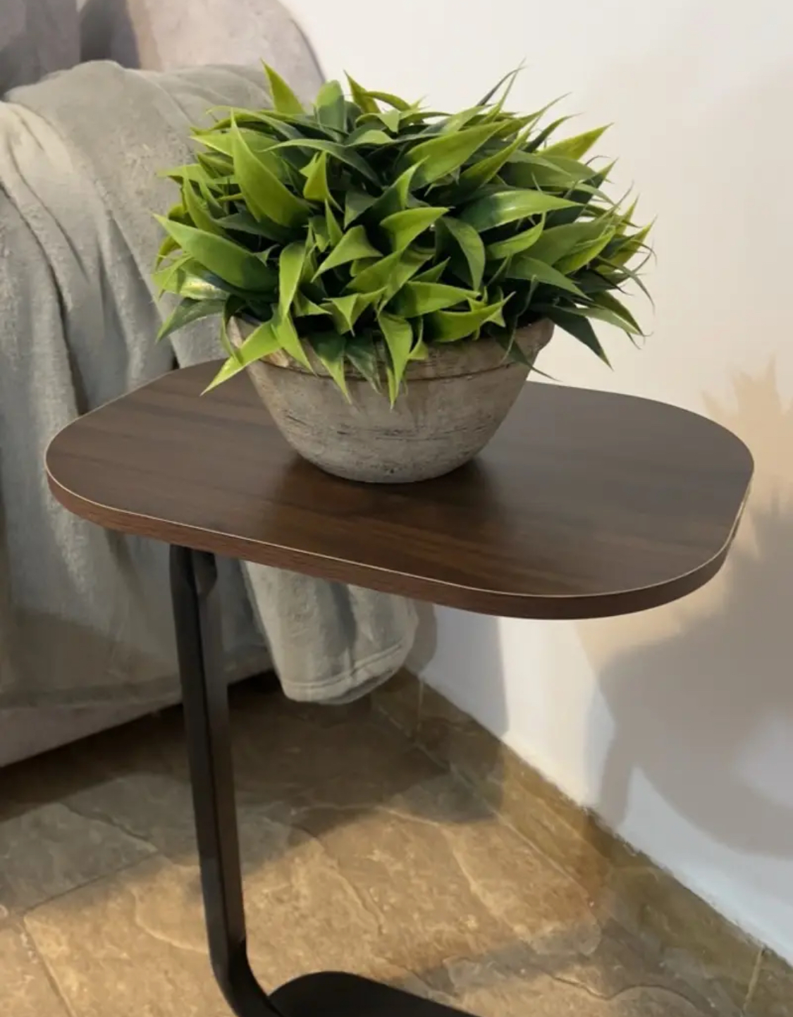 Forma în C a acestei măsuțe permite împingerea facilă sub partea de jos a canapelei, patului sau scaunului, făcând posibilă utilizarea confortabilă fără a te ridica. Blatul oval al mesei previne deteriorările, spre deosebire de marginile ascuțite ale meselor pătrate.