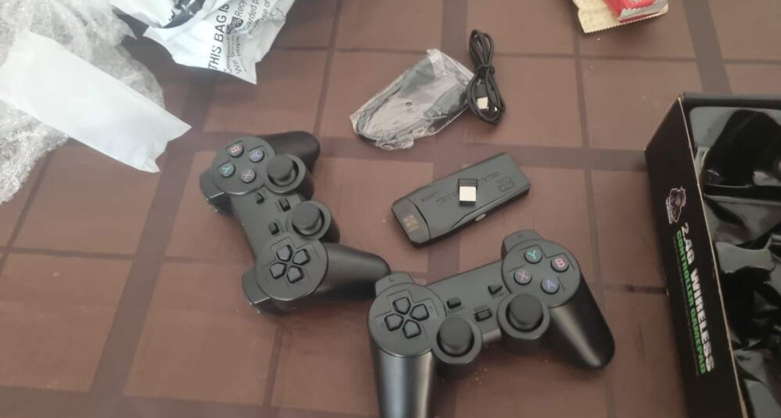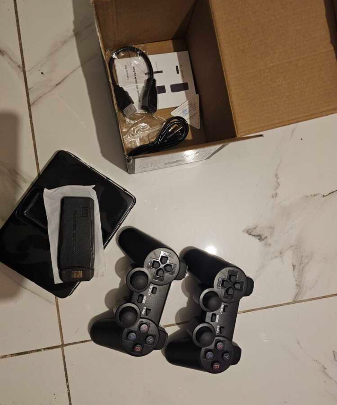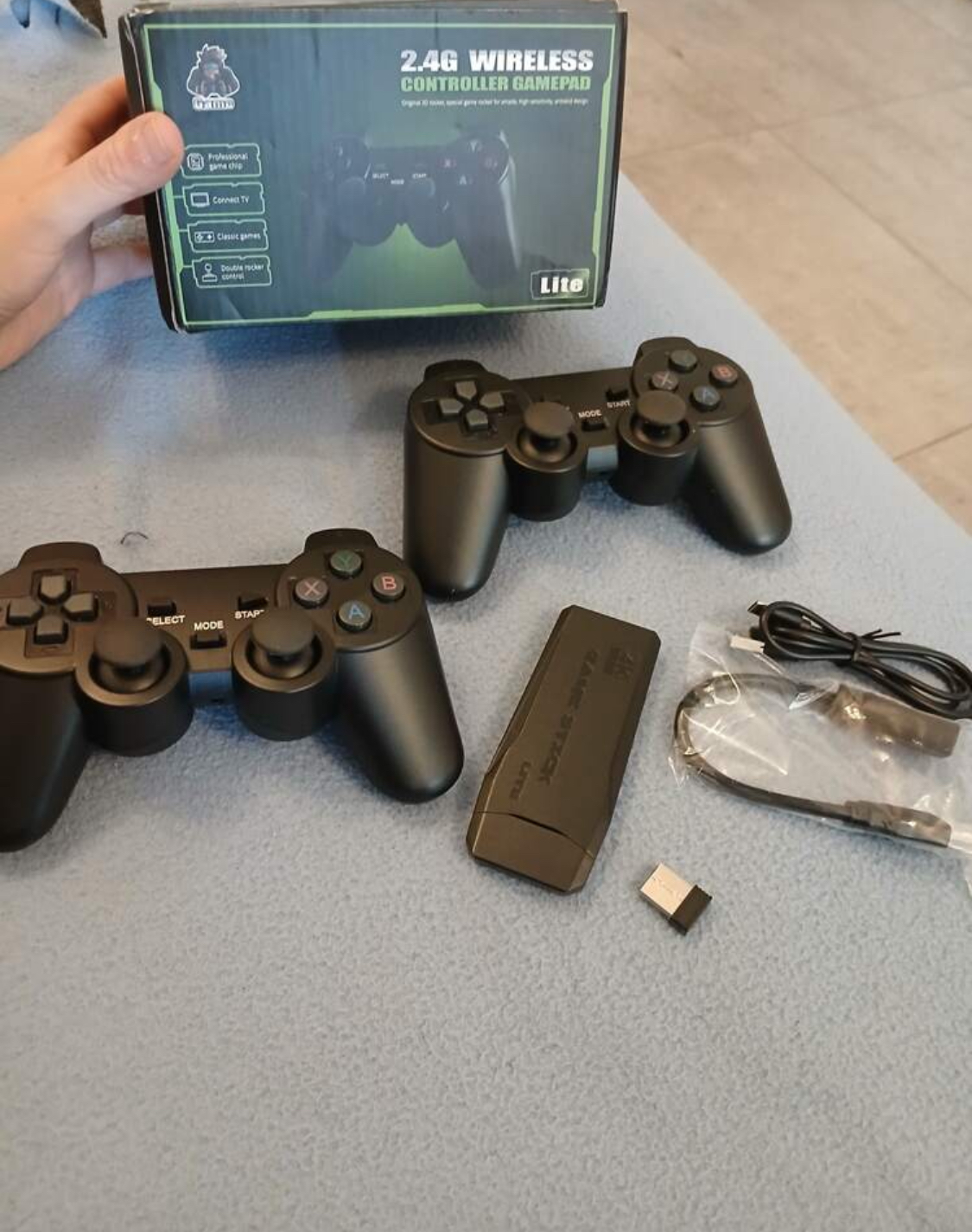 Pachetul include: 1x Consolă de jocuri, 2x Controlere wireless, 2x Receptor de semnal, 1x Extender HDMI, 1x Cablu de alimentare USB, 1x Card SD