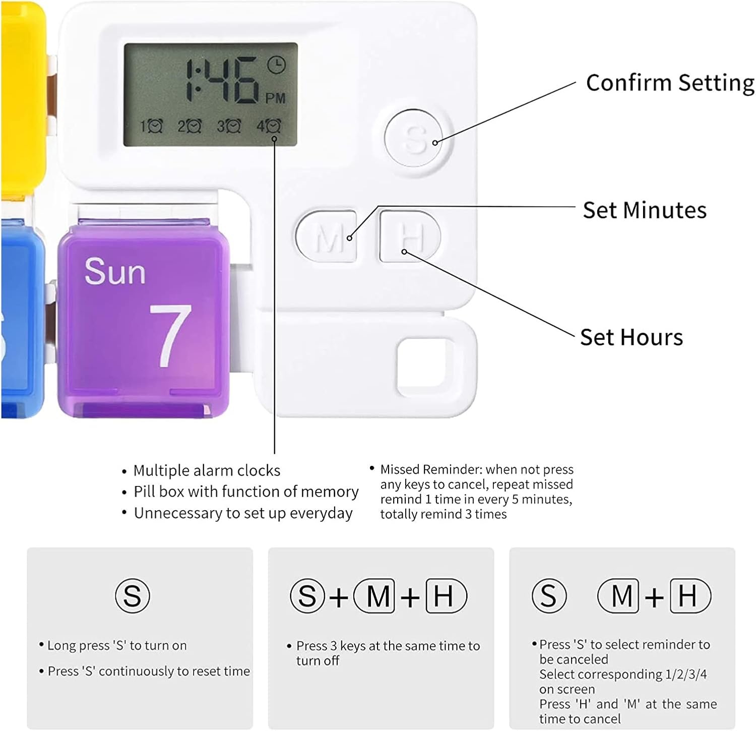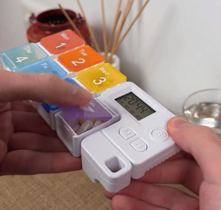 Structura detașabilă face cutia pentru pastile practică de purtat în geantă sau în buzunar. Ecranul clar afișează ora și setările, permițând o ajustare rapidă și ușoară ori de câte ori este nevoie.