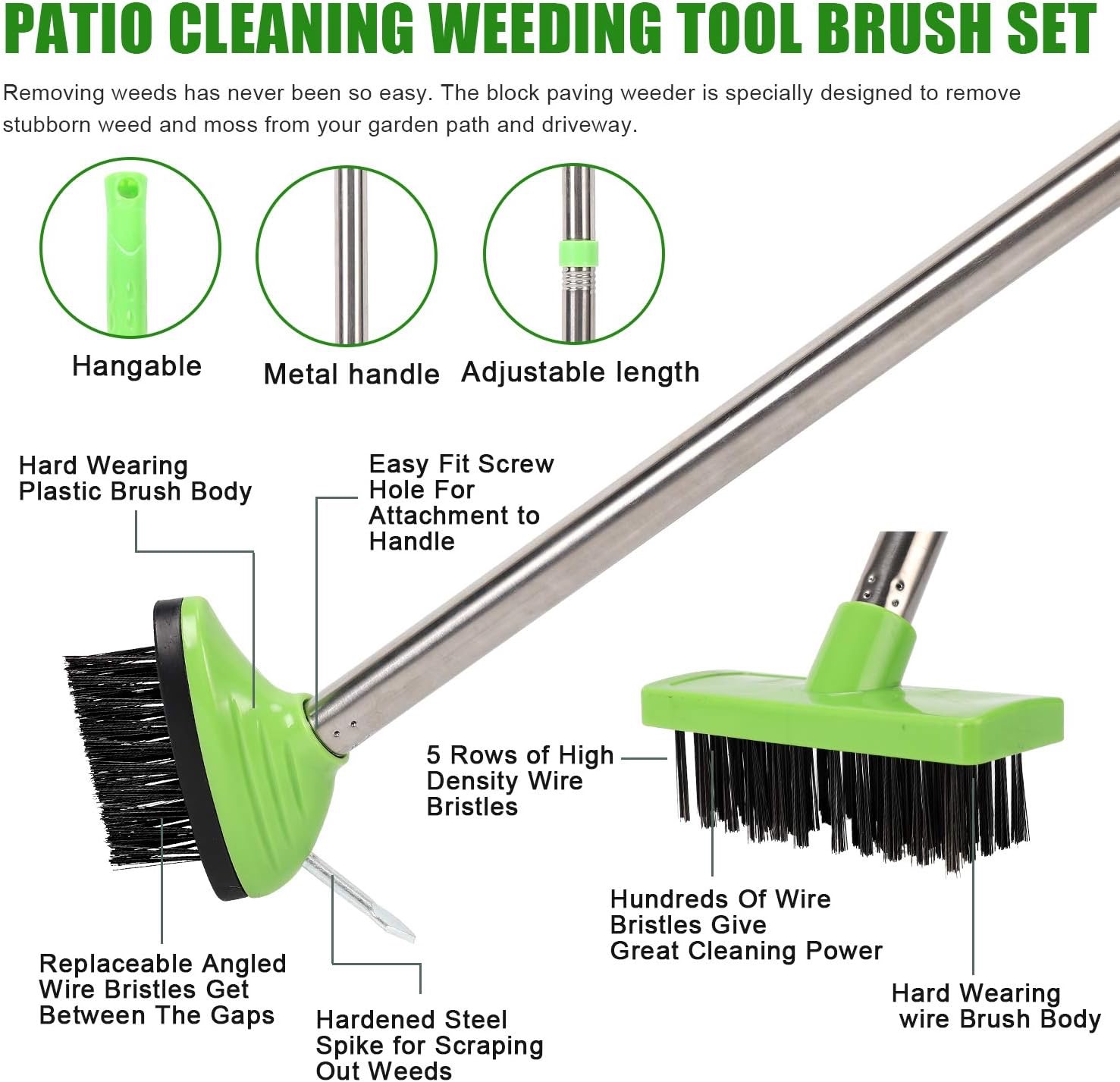 Acest set include o perie înclinată pentru buruieni, pentru curățare de precizie, o mătură lată cu sârmă pentru măturarea suprafețelor și un răzuitor îngust pentru rosturi, pentru murdăria încăpățânată. Fiecare componentă este concepută pentru a face față cu ușurință diferitelor sarcini de curățare.